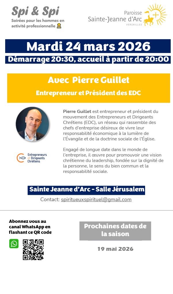 SPI(rituel) et SPI(ritueux) Rendez-vous le : Mardi 24 mars à partir de 20h Salle Jérusalem pour la troisième soirée de cette saison ! Nous recevrons Pierre Guillet Entrepreneur et Président des EDC Inscription en ligne ici Sophie FontanaUncategorized0 Comments